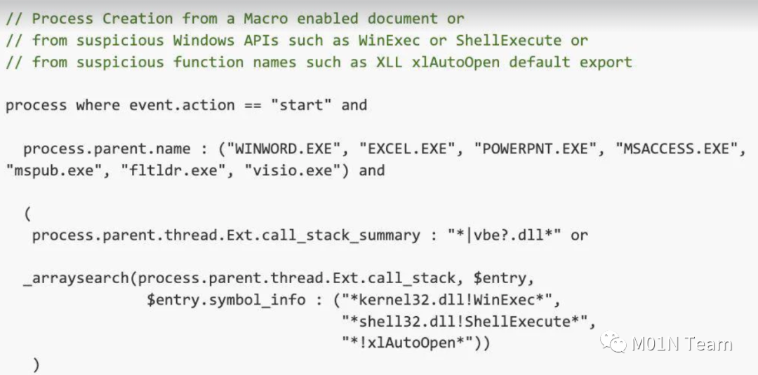 可见,Elastic在内存防护上已经深入到了API调用级别。综合调用堆栈与可疑行为日志信息,Elastic能够更加精准地还原威胁行为的具体细节,对威胁行为进行研判与告警。Elastic基于调用栈实现了对一系列传统方式难以检测的威胁行为的检测告警[2],以上面展示的恶意宏为例: