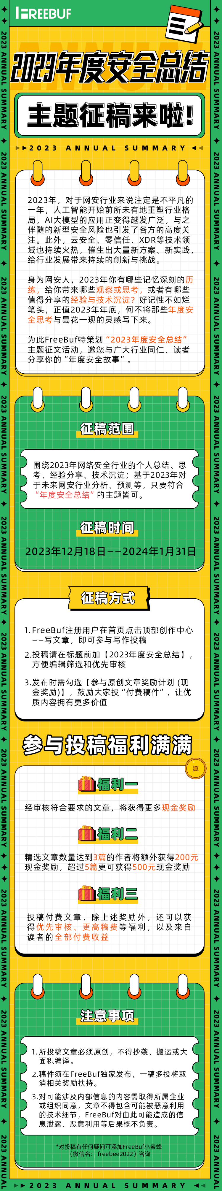 2023 年你有哪些记忆深刻的历练,给你带来哪些观察或思考,或者有哪些值得分享的经验与技术沉淀?好记性不如烂笔头,正值 2023 年年底,何不将那些年度安全思考与昙花一现的灵感写下来。为此FreeBuf特策划“2023 年度安全总结”主题征文活动,邀您与广大行业同仁、读者分享你的“年度安全故事”。