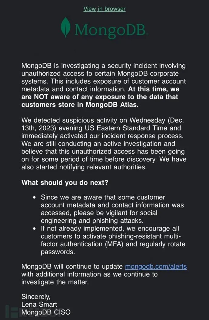 在与 CISO Lena Smart 往来的电子邮件中, MongoDB 声称在周三(12 月 13 日)晚上检测了到其网络系统遭到黑客攻击,事件发生后公司内部立刻成立了网络安全专家组,开始详细调查这一事件。MongoDB在邮件中写道: