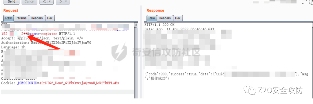 在发送短信验证码的数据包,修改返回包的 Flase 为 Success