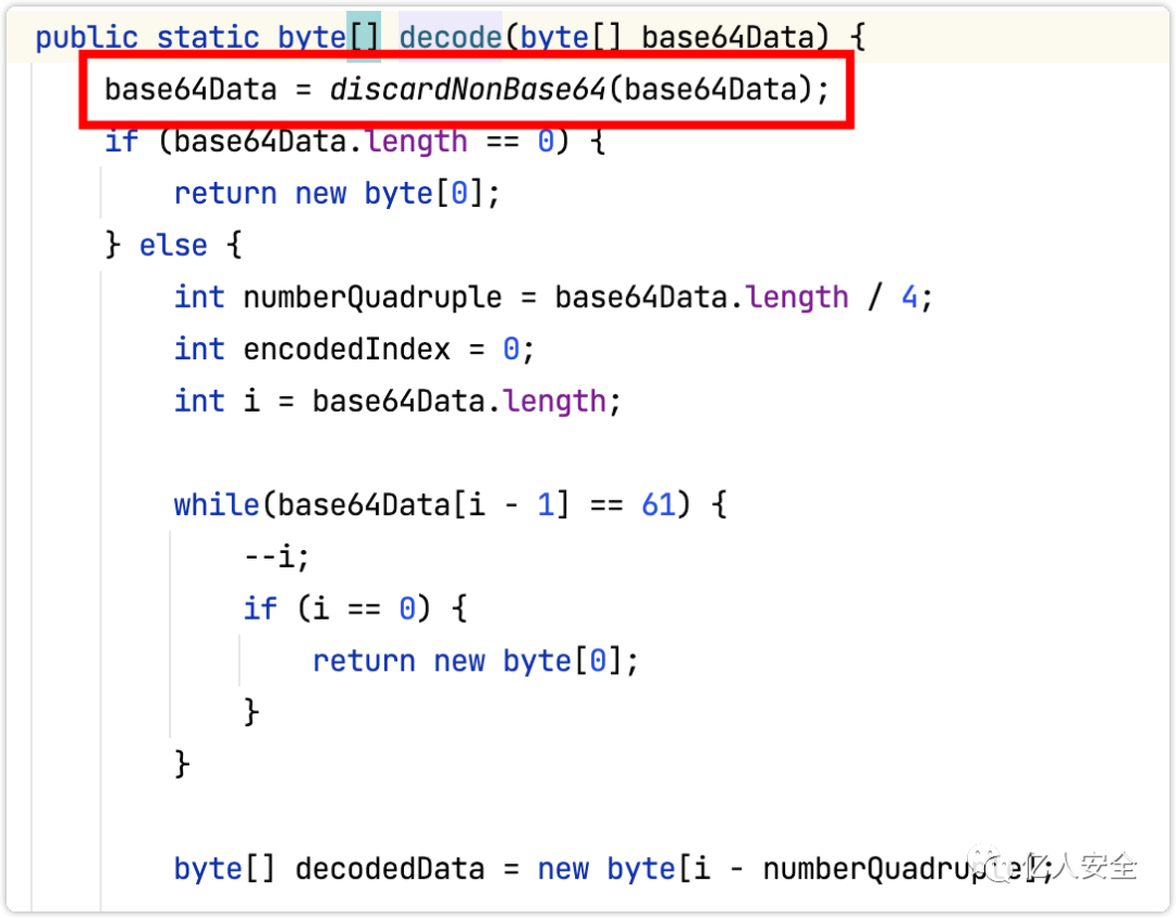如图,在shiro解码base64字符串的过程中,会调用discardNonBase64方法去除掉非Base64的字符