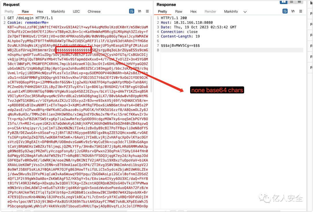那么思路就来了,只需往rememberMe字段的值中填充非Base64的字符即可绕过WAF(比如$符号)