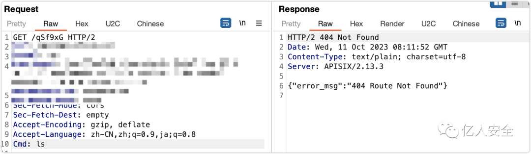 如图使用了apisix网关的WebServer在用户访问不存在的路由时,会抛出如下错误,这可以作为我们指纹识别的特征所在
