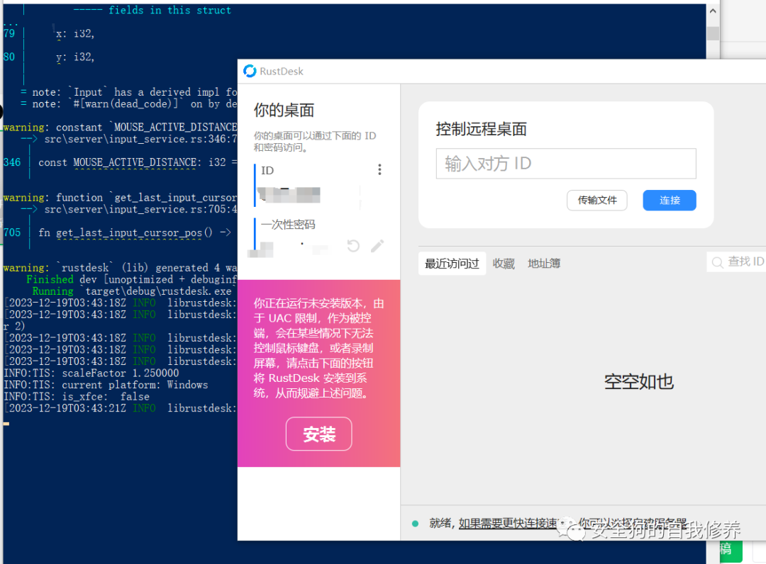 :: on e:\git,下载代码git clone [email protected]:rustdesk/rustdesk.gitcd rustdesk:: 安装必要依赖vcpkg install libvpx:x64-windows-static libyuv:x64-windows-static opus:x64-windows-static:: 安装rust并更新到最新版本rustup update:: 编译运行:: debugcargo run:: releasecargo run --release