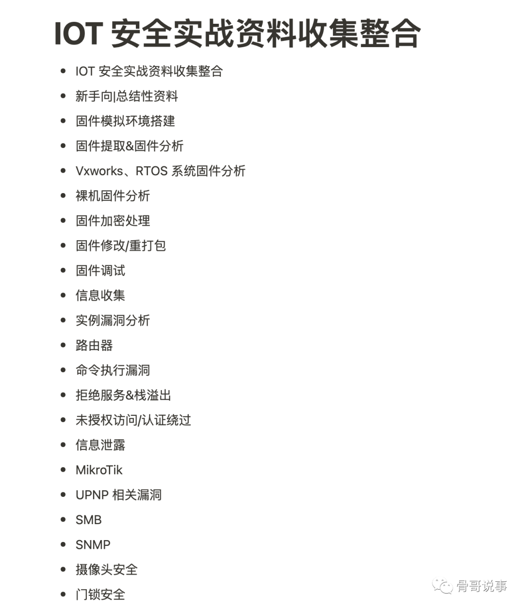 前些年骨哥曾经做过一些 IoT 安全相关的项目,当时在Notion上做过一些整理,今天偶然间在Github上发现一位ID名为H4lo的网友将收集到的 IoT 安全相关文章、教程、资料等URL资源进行了分类与汇总,比前几年骨哥整理的更加丰富,分享给各位,希望对致力于 IoT 安全研究或对 IoT 安全有兴趣的同学们能够有所帮助!
