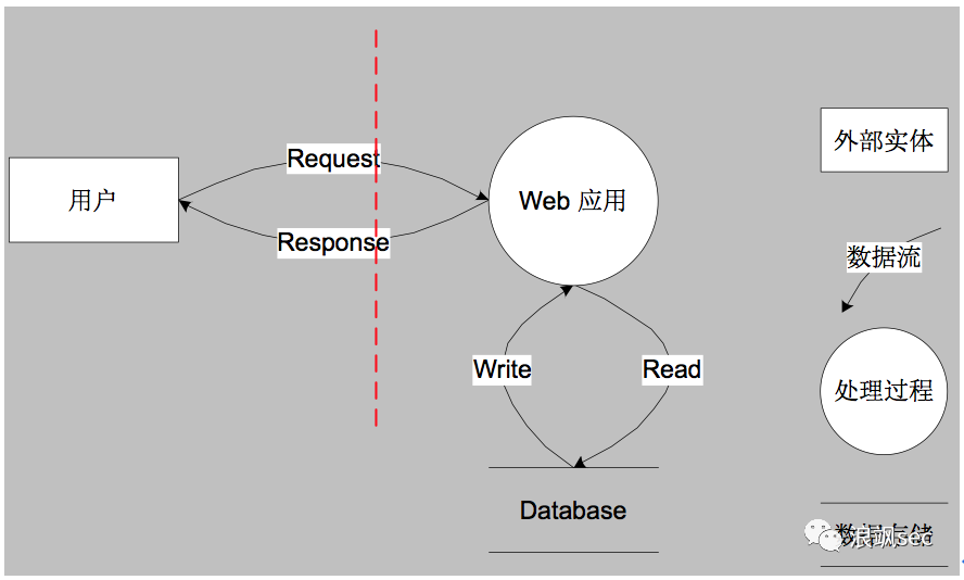 数据流图(Data Flow Diagrams)包含外部实体(External Entity)、处理过程(Process)、数据流(Data Flow)、数据存储(Data Store),安全人员与系统架构师及设计人员沟通,了解设计详情并画出数据流图后还需要标注信任边界(Trust Boundary),针对简单的Web应用的数据流图如下:
