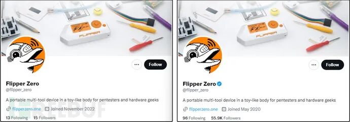随着Flipper Zero 社区人数快速增加,Flipper Zero曾经一度供不应求,一些犯罪分子开始将针对这部分人群进行精准的网络钓鱼攻击。安全人员就曾在推特上发现了3个假的Flipper Zero推特账户,以及2个假的FIFPER官方商店。