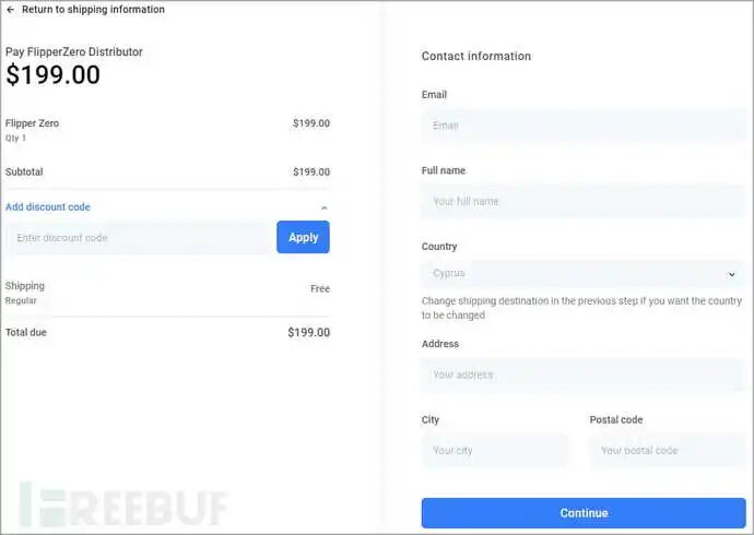 而假的FIFPER官方商店为了更加逼真,与真实官方店的单价保持一致,当用户选择购买时会被重定向至一个假的结账页面,同样是仿造真实商店的样子,并且需要输入电子邮件、姓名和收件地址。当你选择付款的那一刹那,很明显你的钱被骗了,而且个人信息还被泄露了。