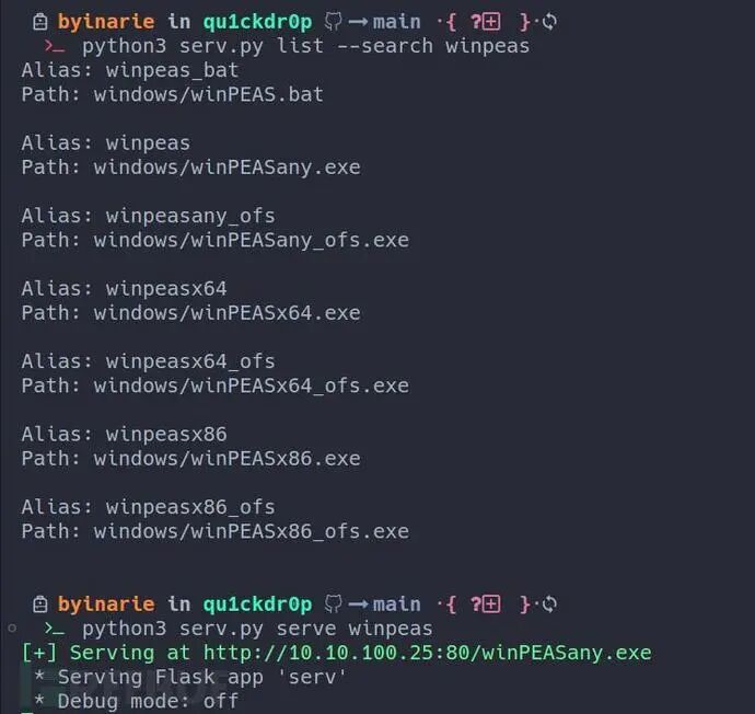 $ serv serve --search ligolo[→] Path: ~/.qu1ckdr0p2/windows/agent.exe[→] Alias: ligolo_agent_win[→] Use: 1[→] Path: ~/.qu1ckdr0p2/windows/proxy.exe[→] Alias: ligolo_proxy_win[→] Use: 2[→] Path: ~/.qu1ckdr0p2/linux/agent[→] Alias: ligolo_agent_linux[→] Use: 3[→] Path: ~/.qu1ckdr0p2/linux/proxy[→] Alias: ligolo_proxy_linux[→] Use: 4(...)(向右滑动,查看更多)