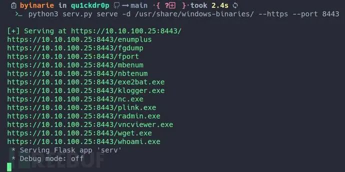 Qu1ckdr0p2提供了别名和搜索功能,相关功能模块位于qu1ckdr0p2-tools库中。默认配置下,使用--https选项时该工具将生成一个自签名证书,,当Web服务器运行时,tun0接口会被优先使用,否则它将使用eth0接口。
