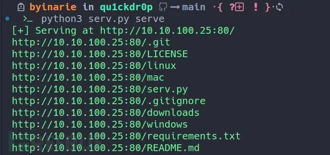 pip3 install qu1ckdr0p2echo "alias serv='~/.local/bin/serv'" >> ~/.zshrcsource ~/.zshrc(向右滑动,查看更多)
