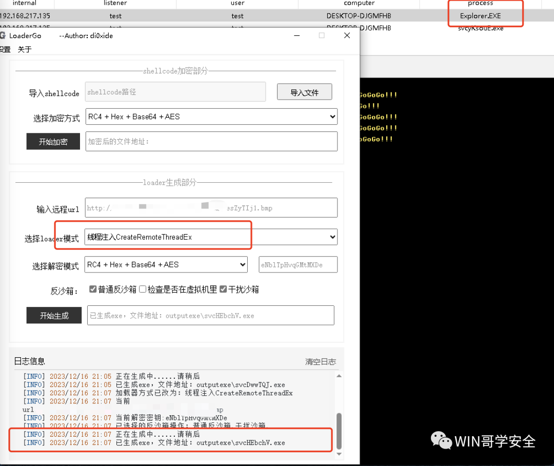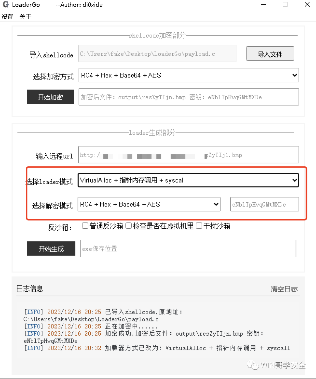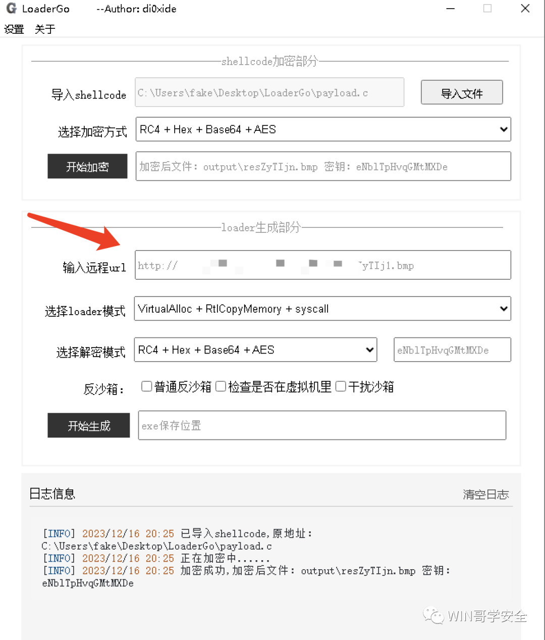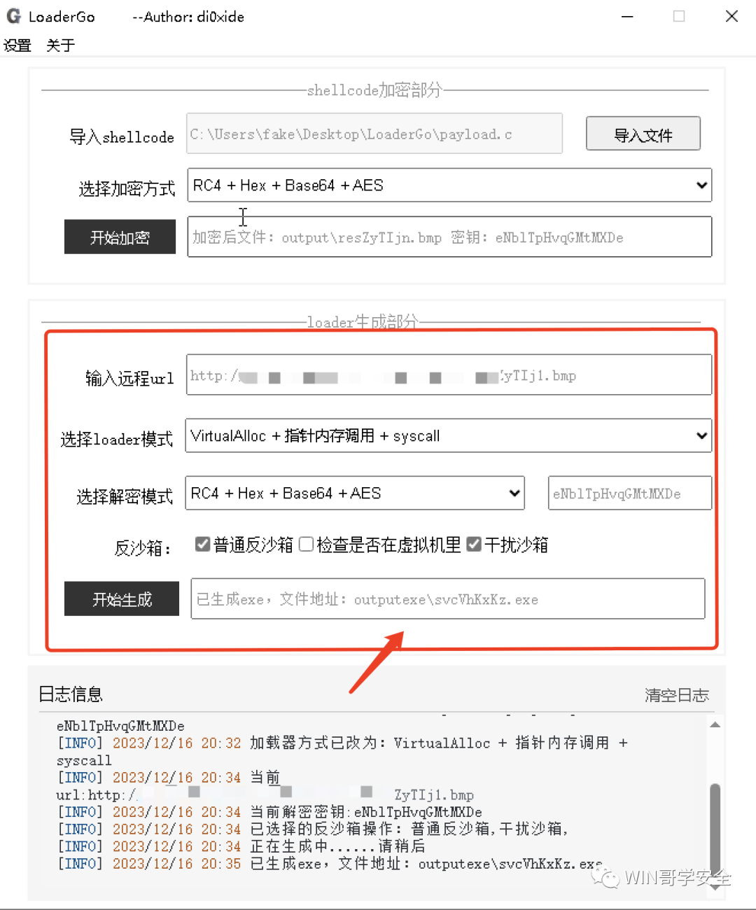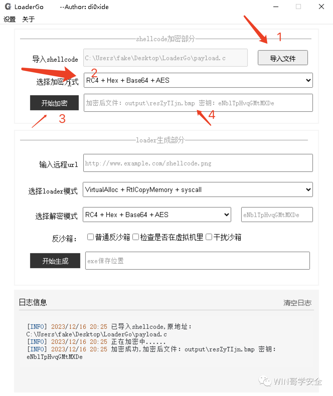 导入shellcode,选择加密方式,这里只写了一种,所以不用选择,直接生成即可。