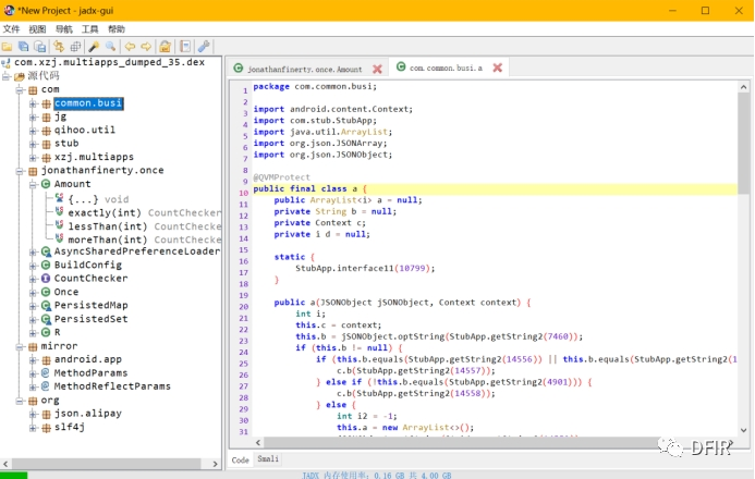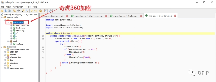 由于Android应用程序的代码都存储在dex文件中,在前面jadx-gui工具打开APK时,看到有qihoo.util,其使用某数字公司的壳进行了软件加固,导致我们无法直接查看.dex文件;我们要想得到dex文件,首先对该Apk进行脱壳操作,然后提取解密后的dex进行功能分析。( jadx-gui查看已加壳)