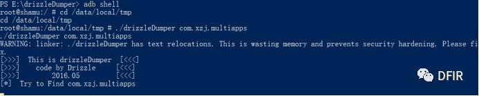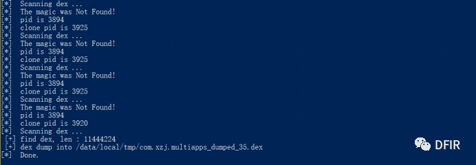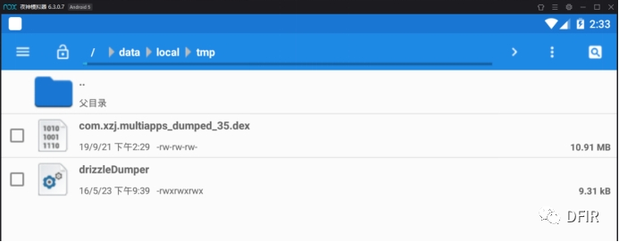 我们回到模拟器的/data/local/tmp文件夹目录下,现在可以看到多了一个"XXX.dex"的文件(有的软件脱壳后存在多个.dex文件),说明已经反编译成功,脱壳出来了。