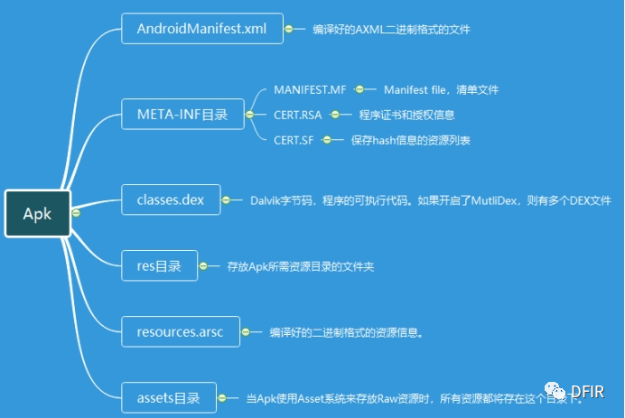 一个完整的Apk文件包含有被编译的代码文件(.dex 文件)、文件资源(resources)、 assets、证书(certificates)、和清单文件(manifest file)。