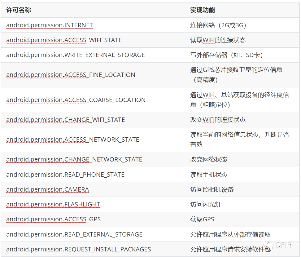 jadx-gui打开Apk,可以看到AndroidManifest.xml <manifest>标签内使用<uses-permission>里面有很多的声明,"android.permission.xxx"的就是应用程序申请的具体权限要求,在权限列表中,我们可以看到,应用申请了哪些请求,下面将该Apk所要申请的(部分)权限列表如下。