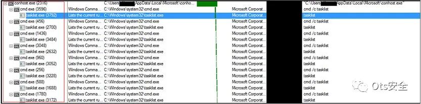 下面是二进制对应的进程树。命令“C:\Windows\system32\cmd.exe /c tasklist.exe”表示正在使用Windows命令提示符(cmd.exe)定期执行tasklist.exe命令。cmd.exe 中的 /c 开关用于执行指定的命令,然后终止。这里,调用命令提示符来运行tasklist.exe命令,该命令列出了系统上所有正在运行的进程。此命令的总体目的可能是检索有关系统上当前正在运行的进程的信息并用于系统监视或信息收集过程。