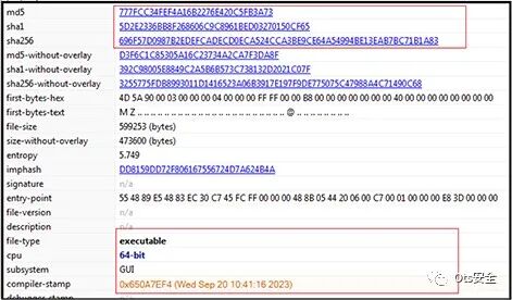该样本文件是 64 位 PE 可执行文件,编译时间为 9 月 23 日,该时间是最近的,表明该活动自 9 月以来一直在运行,因为同一时期还检测到了其他文件样本。