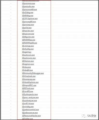 该 trojan.khalesi 系列由阻碍动态分析的恶意软件组成。该软件检查动态分析工具的环境,如果发现它们与我们在示例中注意到的行为相同,则退出。该恶意二进制文件可检测各种监控、恶意软件分析、网络监控、调试器和其他分析工具,包括 processhacker.exe、procmon.exe、pestudio.exe、procmon64.exe、x32dbg.exe、x64dbg.exe、CFF Explorer.exe、procexp64 .exe、procexp.exe、pslist.exe、tcpview.exe、tcpvcon.exe、dbgview.exe、RAMMap.exe、RAMMap64.exe、vmmap.exe、ollydbg.exe、agent.py、autoruns.exe、autorunsc.exe 、 filemon.exe、regmon.exe、idaq.exe、idaq64.exe、ImmunityDebugger.exe、Wireshark.exe、dumpcap.exe、HookExplorer.exe、ImportREC.exe、PETools.exe、LordPE.exe、SysInspector.exe、proc_analyzer .exe、sysAnalyzer.exe、sniff_hit.exe、windbg.exe、joeboxcontrol.exe、joeboxserver.exe、ResourceHacker.exe、Fiddler.exe、httpdebugger.exe 如下所示。