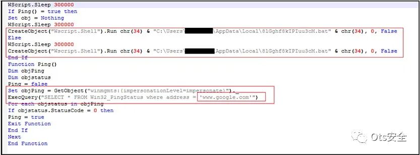 该脚本引入了睡眠延迟,可能会避免立即检测。它通过 ping Google 来检查互联网连接。根据结果,它要么将对象设置为 Nothing 并运行批处理文件 (81Ghf8kIPIuu3cM.bat),要么在另一个睡眠延迟后直接运行批处理文件。