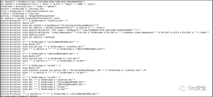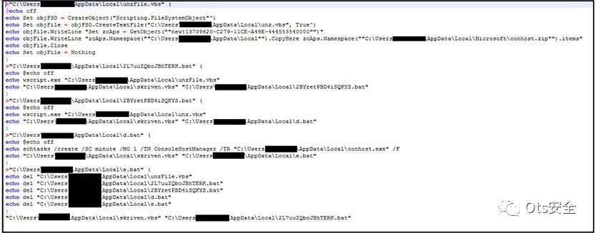 该函数初始化对象和变量,包括 Windows 脚本宿主 Shell 对象 (objShell)、FileSystemObject (objFSO) 和各种文件路径。它创建多个文件(unzFile.vbs、2L7uuZQboJBhTERK.bat 等),并在每个文件中写入特定内容。创建的批处理文件(2L7uuZQboJBhTERK.bat、2BYretPBD4iSQKYS.bat 等)使用 wscript.exe 执行。它使用 schtasks 安排一个新任务,在一分钟后执行 conhost.exe(从 cohost.zip 文件中提取)。