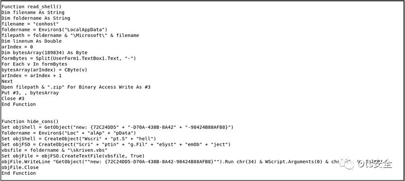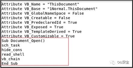 Document_Open 子例程在打开文档时执行。当受害者打开文档时,它会自动调用四个函数(sch_task、hide_cons、read_shell、vb_chain),负责恶意行为的不同方面。