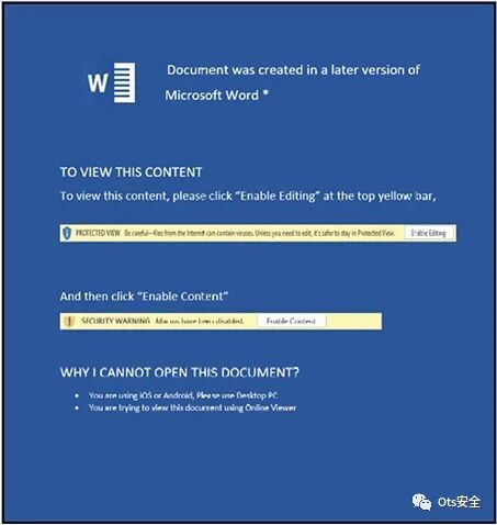 潜在的鱼叉式网络钓鱼电子邮件会传递恶意文档。打开此文档后,就会触发并执行嵌入的恶意宏。当文档提示他们启用编辑时,就会发生对受害者的操纵,如下所示: