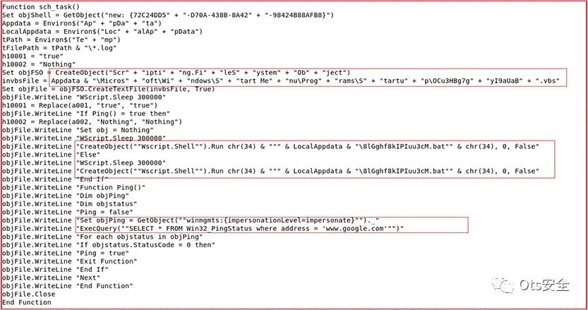 sch_task 函数执行多个操作;它设置环境变量和路径,在启动文件夹 (C:\Users\UserName\AppData\Roaming\Microsoft\Windows\Start Menu\Programs\Startup) 中创建 VBScript 文件 (OCu3HBg7gyI9aUaB.vbs) 以实现持久性。