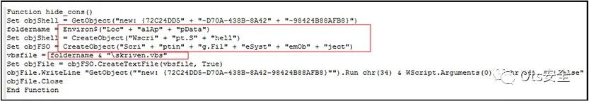 首先,该函数利用 GetObject 方法创建 WScript.Shell 对象,这是恶意软件中执行命令的常用技术。它动态检索 AppData、LocalAppData 和 Temp 等系统环境变量来构造文件路径。随后,在用户的启动目录中生成 VBScript 文件 (OCu3HBg7gyI9aUaB.vbs),以促进持久性并确保在后续系统重新启动时执行。该脚本引入了故意的延迟,例如 WScript.Sleep 300000,这是一种逃避立即检测和分析的策略。