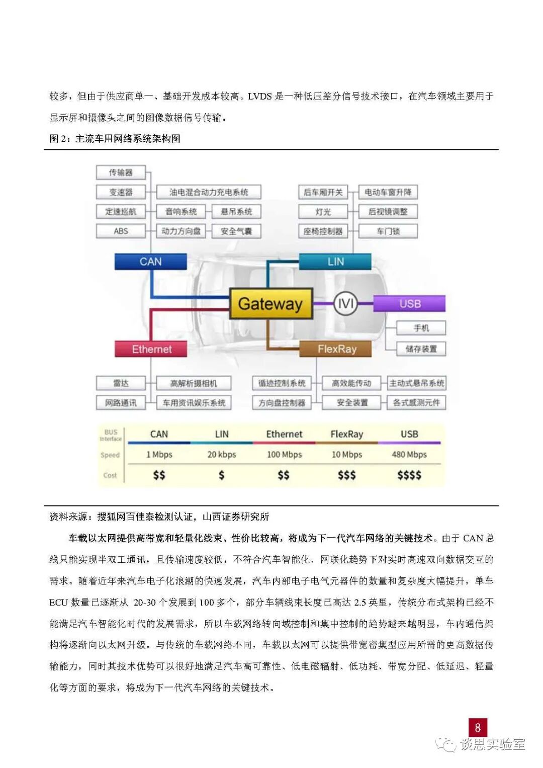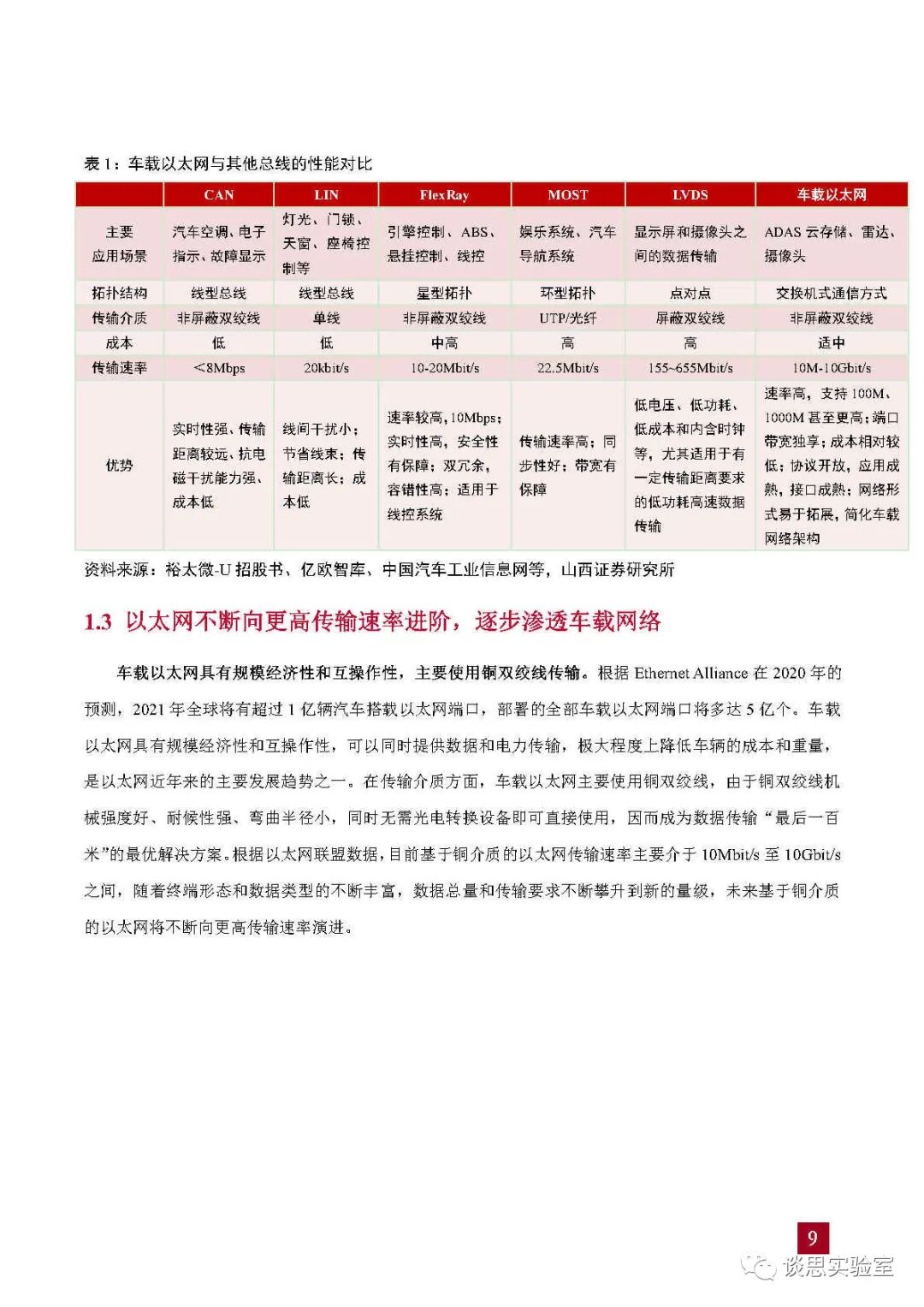 表1:车载以太网与其他总线的性能对比
