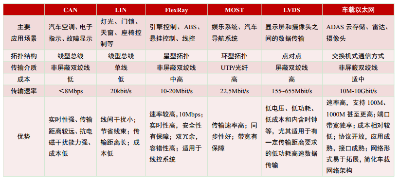 经过多年发展,车载网络已形成以CAN总线为主流,多种总线技术并存的解决方案。目前车辆使用的总线技术有CAN、LIN、FlexRay、MOST、LVDS及车载以太网等,主要以CAN总线为主,LIN总线为辅。CAN主要用于车上控制数据的传输,是现役车载网络应用最为广泛的标准协议;LIN是一种低成本通用串行总线,为CAN总线提供辅助功能,主要用于汽车内的车门、天窗、座椅控制等,CAN、LIN的成本和传输速率较低。FlexRay是继CAN和LIN之后的新一代汽车控制总线技术,与CAN相比拥有更高的带宽,但需加入标准组织、成本较高,主要适用于中高端车中的线控系统;MOST在车载多媒体数据传输的应用较多,但由于供应商单一、基础开发成本较高。LVDS是一种低压差分信号技术接口,在汽车领域主要用于显示屏和摄像头之间的图像数据信号传输。