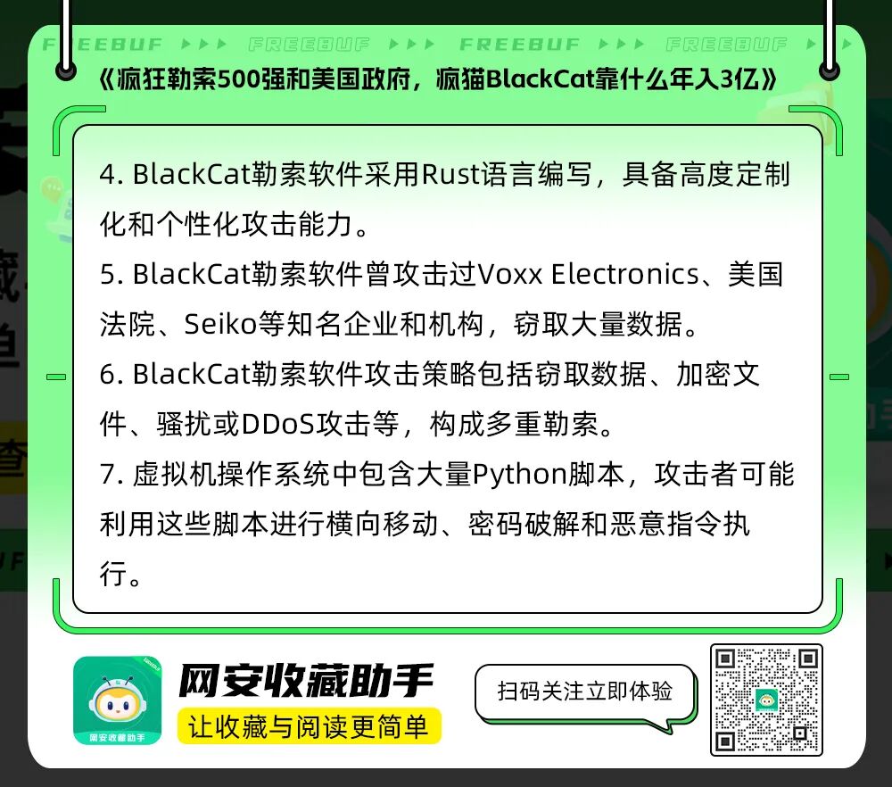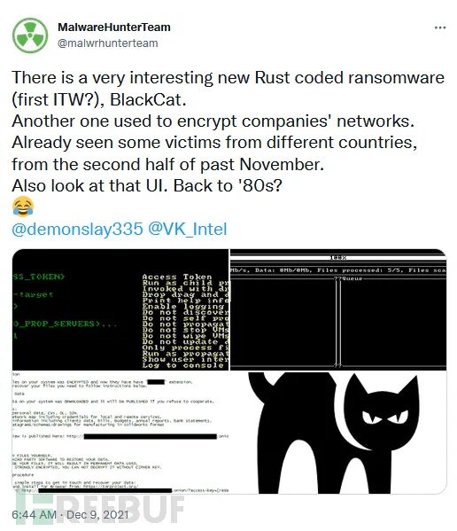 BlackCat勒索软件(又名AlphaVM、AlphaV或ALPHV)于2021年11月中旬首次被Malwarehuntertam研究人员披露,是第一个基于RUST语言编写的专业勒索软件家族系列,并因其高度定制化和个性化的攻击而迅速赢得市场。