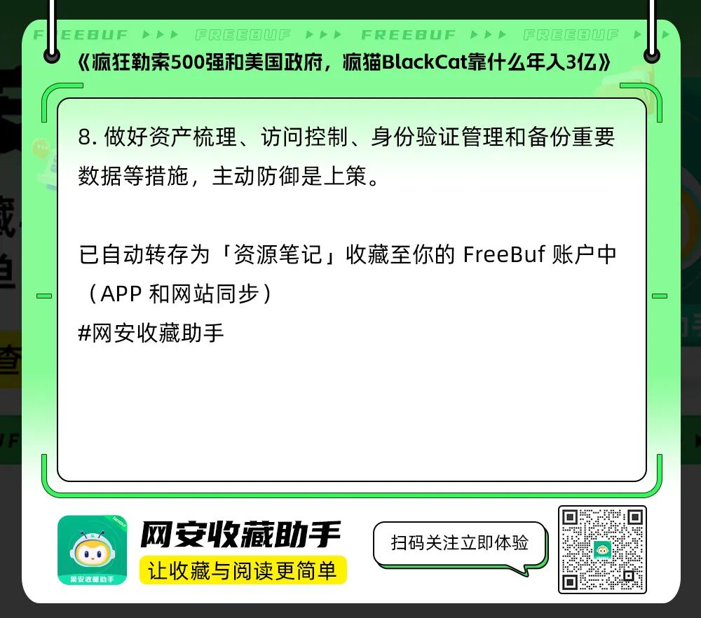 据资料显示,BlackCat 人员与 DarkSide/BlackMatter 前勒索团伙还可能存在一定渊源,这表明其幕后的行为者经验极其丰富,且该勒索团伙所采用的三重勒索策略近年来一直在随着市场环境“推陈出新”。种种迹象表明,BlackCat 团伙未来仍将成为勒索软件市场的主要参与者之一。虽然 BlackCat 目前的重点攻击目标是国外用户,但国内用户也应加强防范,规避此类风险。