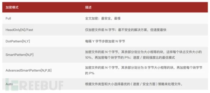 另外,根据官方说明,BlackCat 勒索软件支持四种加密模式。但据 SentinelLabs 研究员 Aleksandar Milenkoski 对 BlackCat 勒索软件样本进行逆向分析得出其加密模式实际存在 6 种,具体描述如下表。