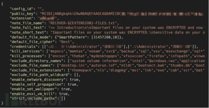 BlackCat勒索软件载荷通过Rust编程语言编写,执行载荷需要一个特定的Access Token参数,解密获取写入勒索载荷文件中的加密配置文件。配置文件为攻击者入侵受害系统后,根据受害系统实际情况而设定的文件内容,配置文件中包括要停止的服务和进程列表,跳过加密的白名单目录、文件和文件扩展名列表等内容。未获得Access Token参数则无法执行载荷文件,目的是阻碍安全研究人员和沙箱工具对载荷进行分析。