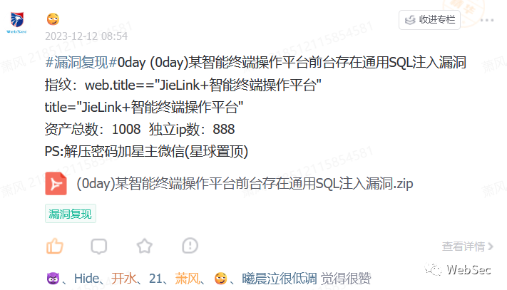官方已发布安全更新,建议访问官网联系售后升级补丁我们郑重承诺,每个工作日都会定时推送高质量的1day,有时也会分享未公开的0day。