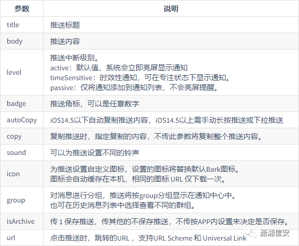 我们修改的Bark上线通知插件只用到这个API的title、body、group参数,至于其他参数大家可根据自己的需求选择,支持的参数如下图,具体效果可在APP内预览。