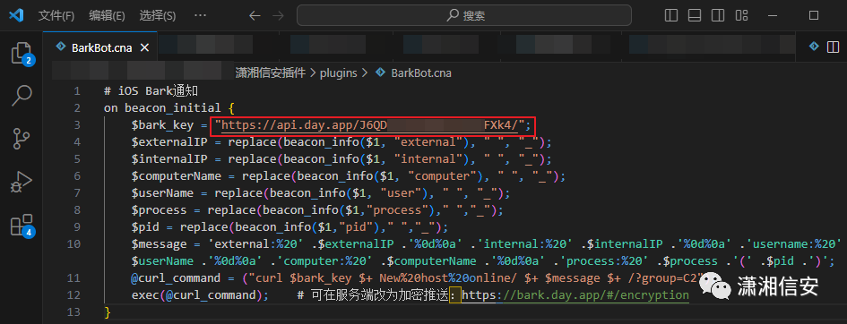 根据开源代码改了个CobaltStirke的Bark上线通知插件,新建BarkBot.cna,将以下代码copy进去,然后再把从Bark APP复制的Key粘贴到$bark_key即可,需保留最后的/。