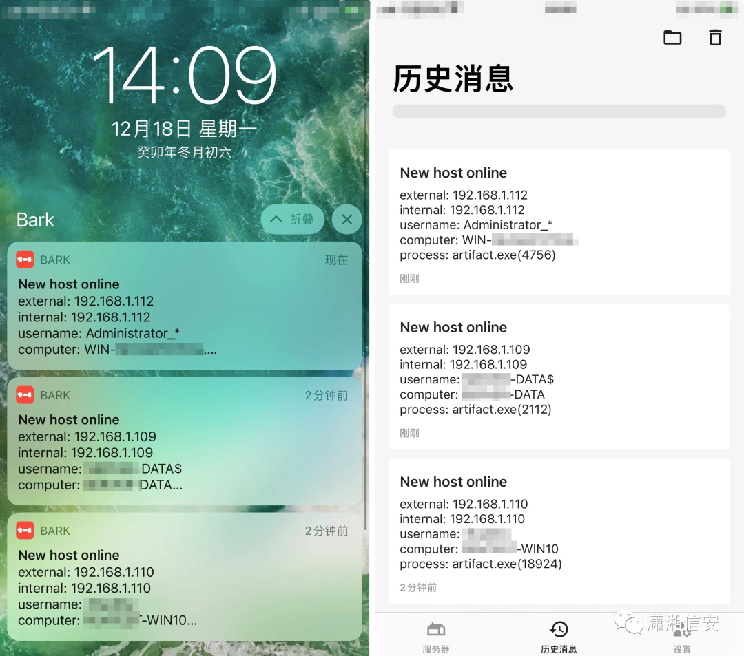 随便生一个木马文件执行上线即可,不出意外的情况下iOS设备就会收到Bark推送过来的主机上线信息,在APP历史消息中可查看之前推送过来的所有信息,如下图所示。