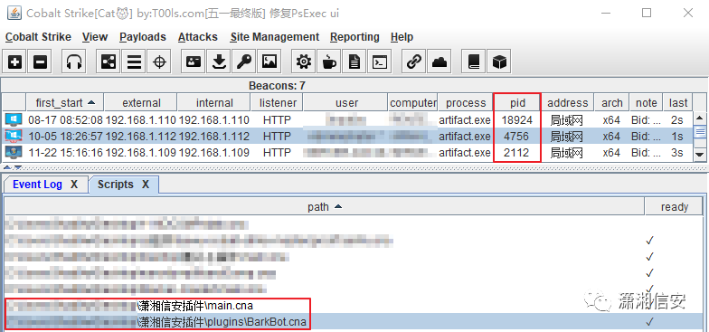 这里只写了获取上线主机的公网IP、内网IP、计算机名、当前用户、会话进程名和PID,可自行修改,接着我们在CobaltStirke客户端加载下BarkBot.cna上线通知插件即可。