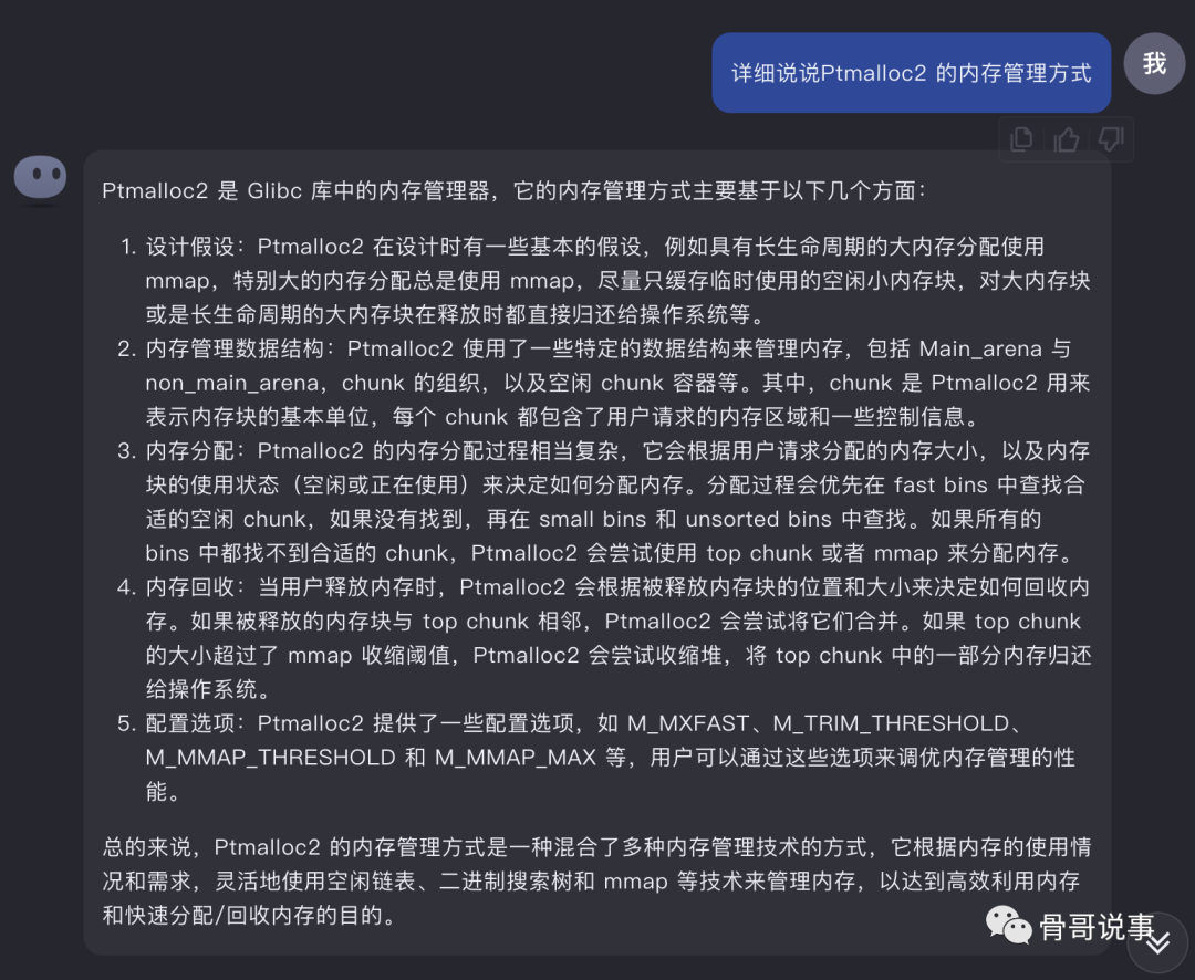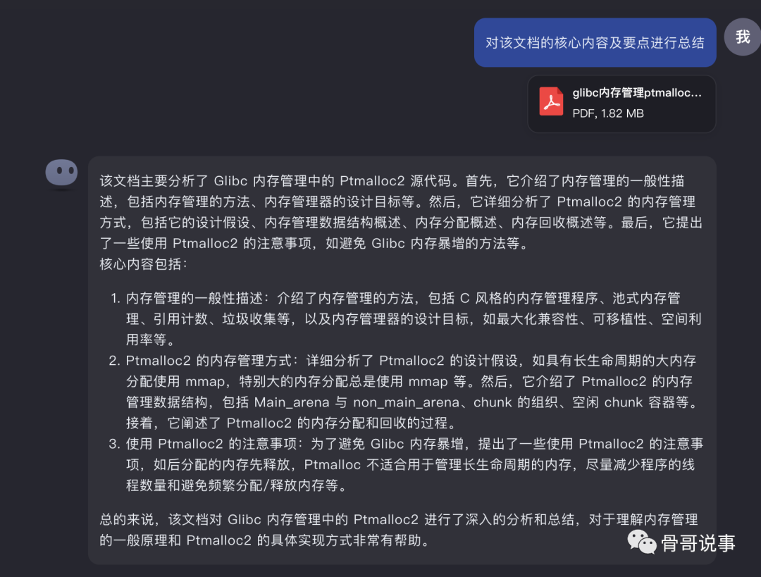 来看看实际效果如何,骨哥随手上传了一份ptmalloc的PDF文档,要求它对核心内容和要点进行总结: