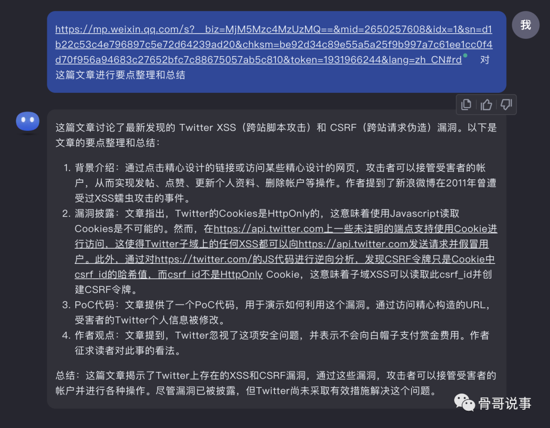 然后骨哥丢给它一篇公众号文章链接,要求它进行要点整理和总结: