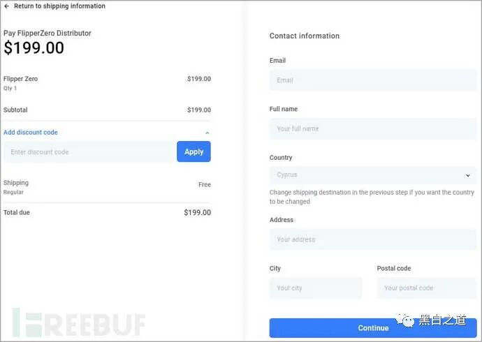 而假的FIFPER官方商店为了更加逼真,与真实官方店的单价保持一致,当用户选择购买时会被重定向至一个假的结账页面,同样是仿造真实商店的样子,并且需要输入电子邮件、姓名和收件地址。当你选择付款的那一刹那,很明显你的钱被骗了,而且个人信息还被泄露了。