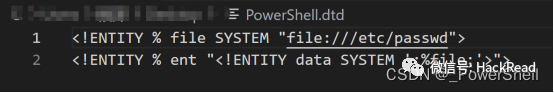 攻击机上写入一个可以访问的xml文件,我这里文件名字为PowerShell.dtd,文件内容如下