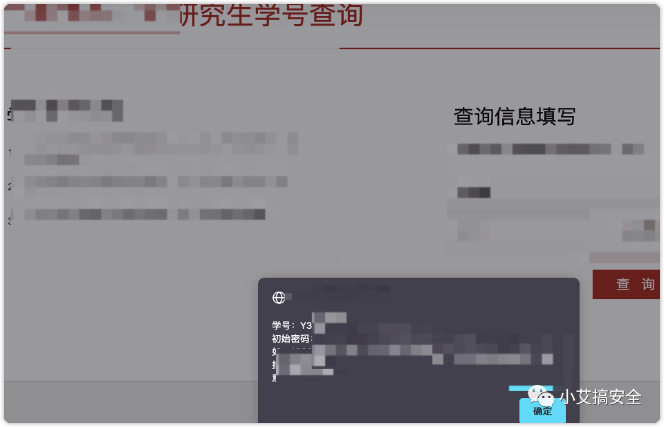 但是目标高校正值开学季,开放了一个研究生学号的查询系统,可以使用研究生的sfz+姓名 查询学号和初始密码