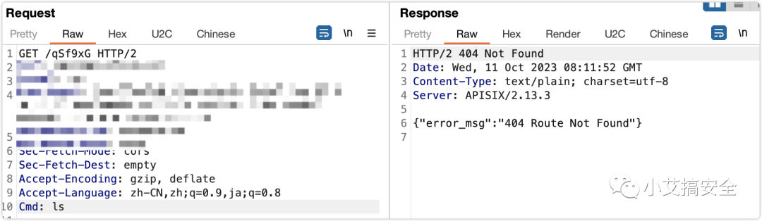 如图使用了apisix网关的WebServer在用户访问不存在的路由时,会抛出如下错误,这可以作为我们指纹识别的特征所在