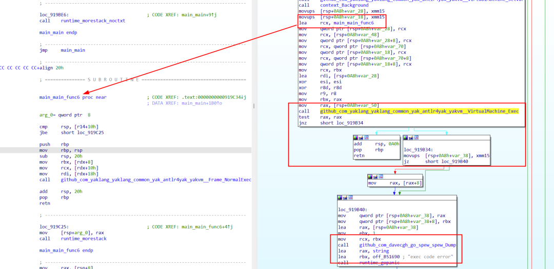 该题目使用 golang 编译,需要使用一定手段恢复符号。恢复符号以后,将会看到一下内容:调用 NewCodeMarshaller 并继续调用其 Unmarshal 方法,这是反序列化 yakc 文件也就是题目中的 marshalCode 文件,之后调用 NewWithSymbolTable 创建一个新的作用域。然后不断调用