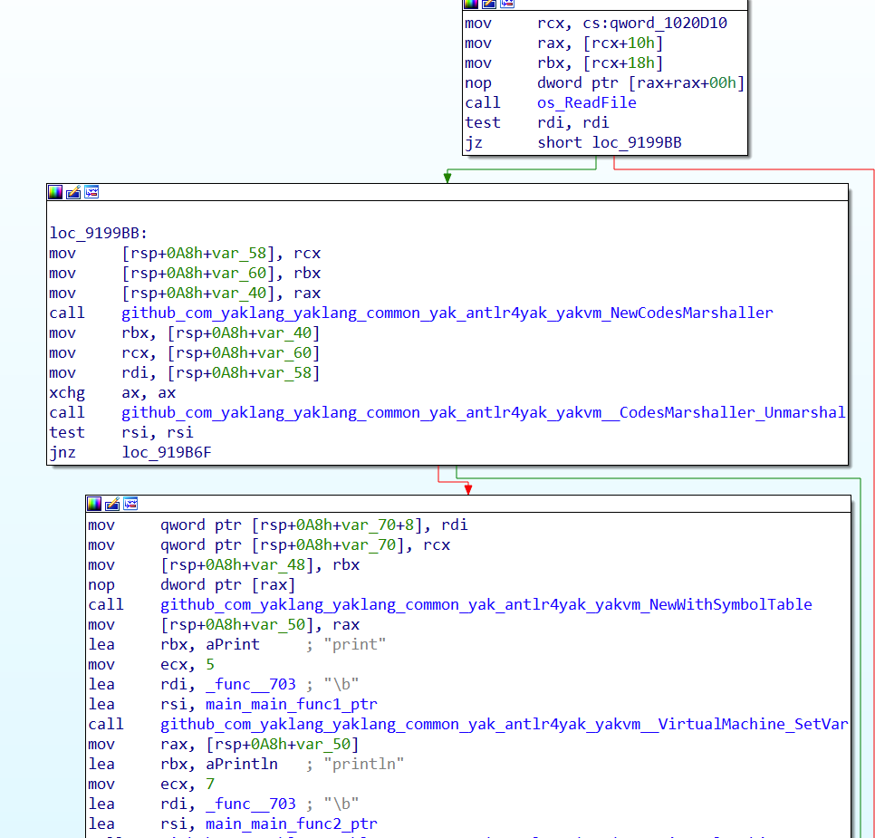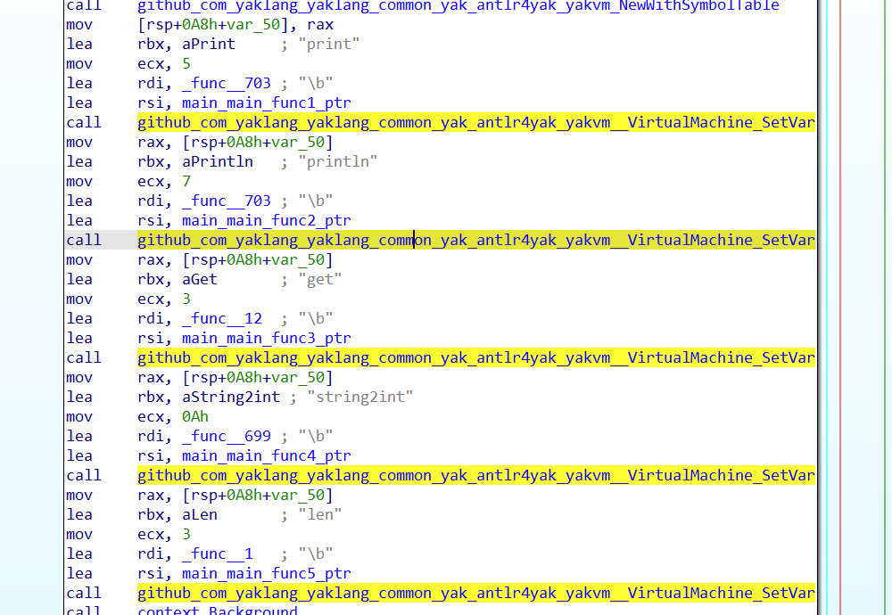 注意在这里直接使用 yakvm.ShowOpcodes(code) 这样的 API 即可直接打印出 Opcode 的反汇编版本。同时,将所有注入的变量全部写一遍,都是直接打印数据。需要继续逆向一下各个子函数确定他们的意思,里头都是调用的 Golang 标准库 API,比较简单。